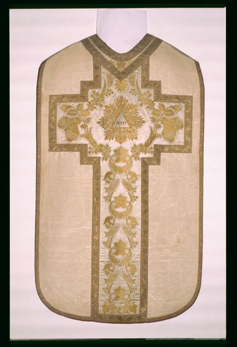 Chasuble, en satin blanc et fils d'or, comportant une croix à décor floral et le tétragramme.