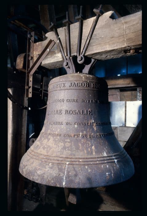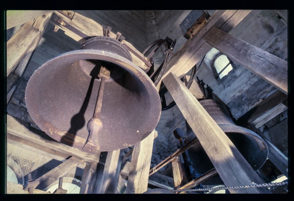 Cloches en acier coulé avec battants en fer forgé et jougs en bois. Notes : La, Si, Do dièse.