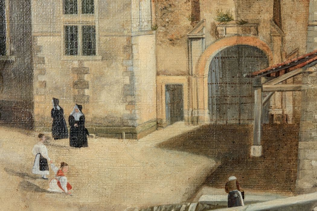 tableau : Vue de Sorcy montrant le château, le pont, le moulin