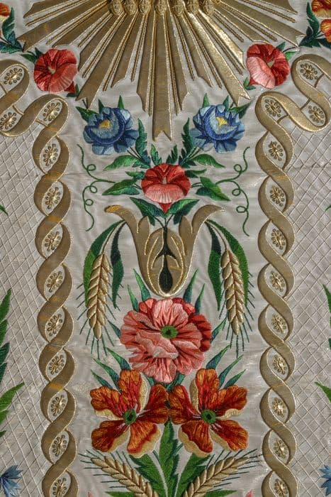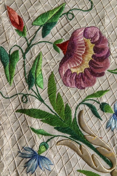 satin : brodé ; fil métal (or) ; soie (fil) : polychrome ; laiton