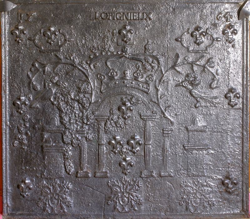 Plaque de cheminée ornée d'un motif architectural surmonté d'une couronne royale, de fleurs de lys et d'oiseaux.