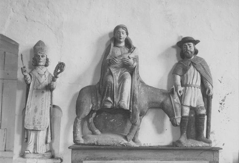 Pierre blanche polychromée. Le groupe se compose de deux statues : la Vierge et l'enfant sur un âne ; saint Joseph.