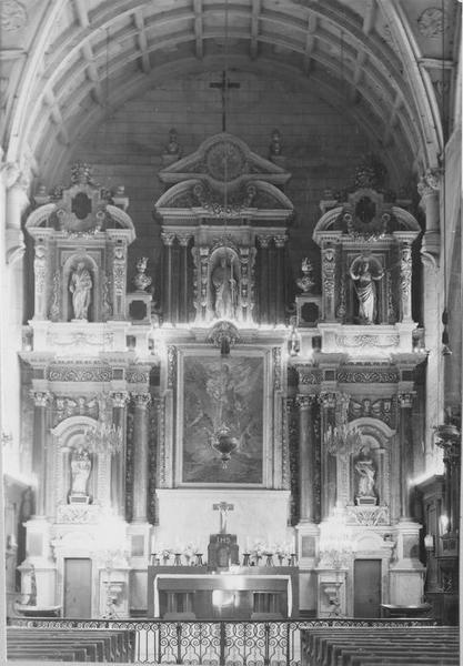 Retable majeur. Le tableau central représente la Résurrection. De chaque côté sont deux niches à frontons cintrés, encadrées de trois colonnes qui supportent un entablement. L'étage supérieur comporte aussi trois niches dont les riches frontons sont supportés par des cariatides.