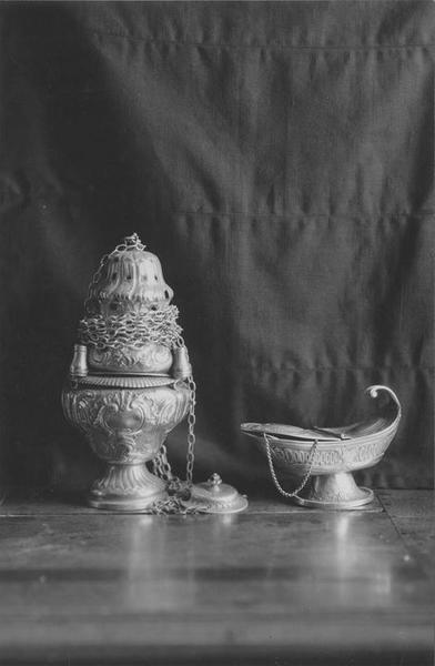 Inscription : Donné par Jacquette Houaix, fe de Danielo, à la paroisse des Fougerais (base, sur le rebord). Date : l'an 1773 (poignée). Poinçon de maître : C B au-dessous d'une couronne et au-dessus d'une fleur de lys, poinçon de maître probable de Charles Brouard, orfèvre à Nantes, signalé dès1742 (sous la base). Poinçon de ville : NAN, avec au-dessous TES, avec une fleur de lys de part et d'autre, et six points au-dessus, poinçon de Boistaud, sous-fermier de 1769 à 1790 (sous la base). Poinçon : D, avec une étoile de part et d'autre et au-dessous, et une couronne au-dessus, poinçon indiquant le millésime 1771 (sous la base).