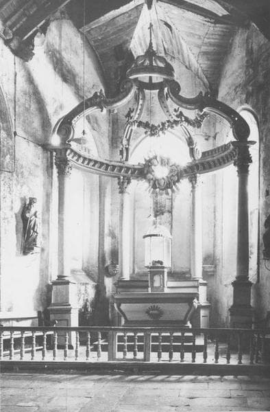 Baldaquin de plan demi-circulaire. Quatre colonnes de faux marbre à chapiteaux composites reposant sur de hauts stylobates à deux étagements supportent un entablement à corniche très saillante, interrompue en son centre par un triangle de la Trinité dans une gloire ornée d'une couronne de têtes de chérubins. Elles supportent quatre volutes rocaille reliées par une guirlande de fleurs dont il manque une partie, portant une couronne fermée sommée d'une croix.