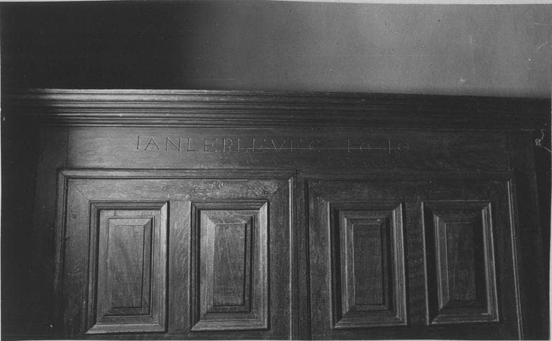 Armoire comportant sur trois faces des panneaux sculptés, à décor géométrique et symétrique. A la base, deux tiroirs. Au-dessus, deux battants dont les montants encadrent cinq panneaux posés deux un deux. Au sommet, corniche moulurée. Les côtés reproduisent en plus grande dimension le décor des portes.