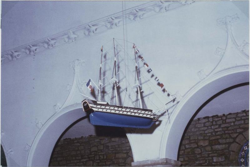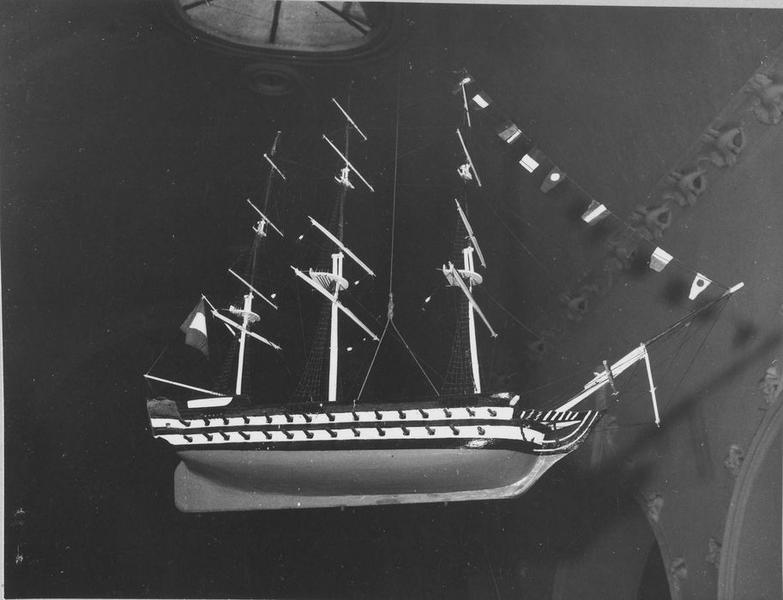 Maquette de la frégate trois mâts carré l'Alexandre Briel. Coque : au-dessous et entre les batteries en noir ; sous ligne de flottaison en bleu ; aux niveaux des deux batteries inférieures en blanc ; gouvernail non mobile. Armement : deux batteries de chaque côté et une troisième batterie de trois canons sur le pont et deux sabords de retraits à la poupe ; canons : fûts noirs et gueules rouges. Pont : pont et gaillard arrière en rouge, une embarcation blanche, de part et d'autre du mât d'artimon. Mâture : quatre vergues et deux hunes à chaque mât ; bas mâts, vergues, hunes, beaupré en bleu ; corne d'artimon en blanc (avec un fanion tricolore) ; onze fanions de coton entre le bout dehors et le mât de misaine.