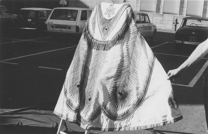 Chape offerte par la princesse de Murat réalisée dans une de ses robes de bal ornée de plumes de paon.