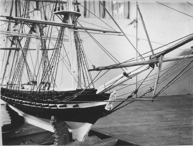 Maquette, trois mâts carré, frégate, le Pie IX. Coque : taillée dans la masse ; noire, blanche sous la ligne de flottaison, bande blanche au niveau de la batterie inférieure. Armement : deux batteries (au total soixante sabords) ; canons en métal noir et gueules rouges. Pont : ocre rouge ; à l'arrière de chaque côté, un canot creusé dans la masse et suspendu à l'extérieur (canot noir et blanc) ; gaillards avant et arrière (blancs) surélevés. Mâture : quatre vergues (jaunes) et deux hunes à chaque mât (mât jusqu'à la première hune blanc et ensuite couleur bois).