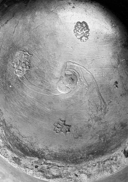 Poinçon : F P séparés par une hermine, sous une couronne (sous la base). Poinçon : E surmonté de trois points, avec une croix (?) au-dessous (sous la base). Poinçon : hermine couronnée, avec deux éléments au-dessous (?) (sous la base).