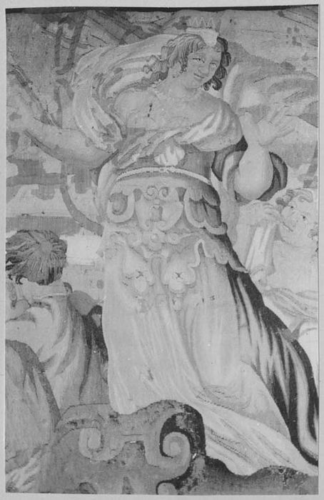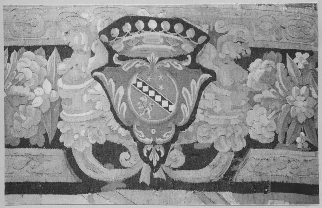 L'un des médaillon a été recouvert ultérieurement par les armes des Berset d'Hauterive. Cette tapisserie provient de la succession du château d'Hauterive à Argentré en Mayenne. Changement de propriétaire le 20/11/1987.