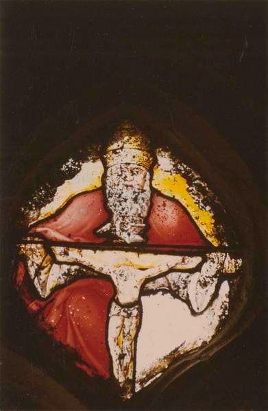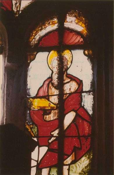 Trois fragments de vitraux représentant, dans la lancette de droite, un évangéliste (saint Mathieu ?) , dans la partie haute du fenestrage, la sainte Trinité et dans la partie haute de la lancette gauche, un autre évangéliste (saint Marc ?).