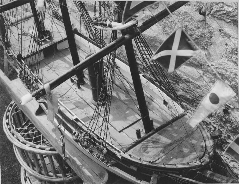 Maquette de procession d'un trois mâts carré de guerre à navigation mixte, le saint-Pierre. Coque : lattes sur membrures ; sous ligne de flottaison, en brun, bande blanche au niveau de la batterie, bande verte pâle sous la batterie et vert foncé au-dessus ; figure de proue féminine ; deux fenêtres vitrées à la poupe. Armement : une batterie de dix sabords de chaque côté ; emplacements de quatre canons sur le pont et cinq pièces au gaillard arrière. Pont : pont supérieur latté, en blanc et second pont sous la batterie ; cheminée verte, avec la base et le sommet en noir. Mâture : mâts noirs ; une hune (blanche) et trois vergues (blanches) à la misaine et au grand mât (seulement deux vergues au mât d'artimon) ; grand pavois de trente neuf pavillons et dix rubans.