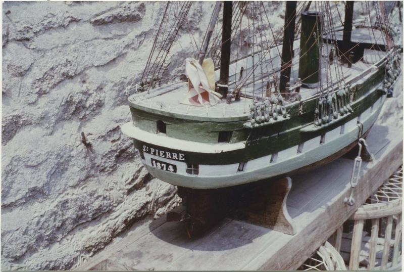 Inscription : St-Pierre 1874 (à la poupe, en lettres blanches sur fond noir). Date : 1874 (à la poupe, en lettres blanches sur fond noir)