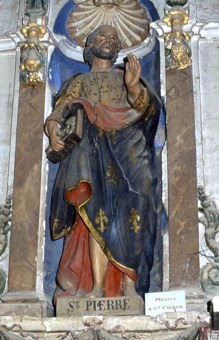 Statue de saint Pierre dans une niche au Nord du retable, en bois polychrome, avec des chandeliers en fer forgé à trois branches fixés sur le socle.
