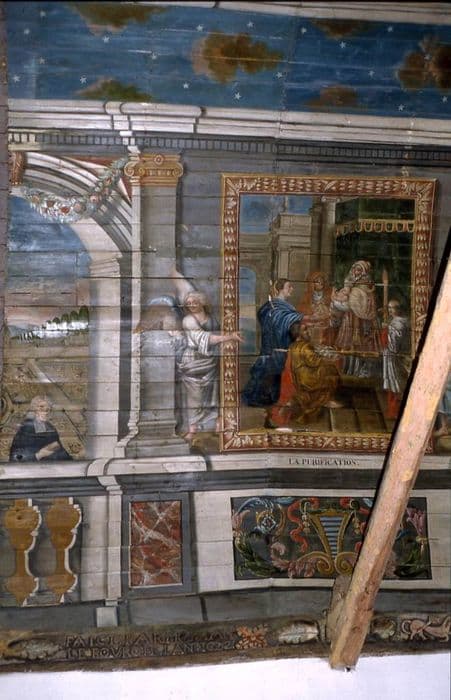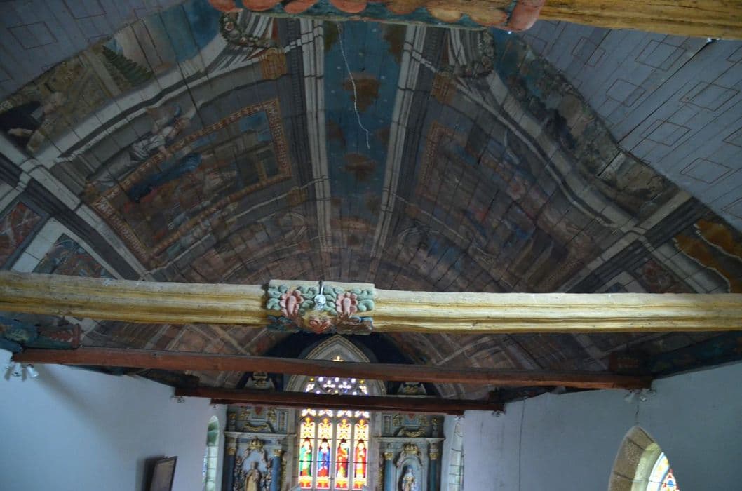 Sablières, entraits et lambris. Voûte peinte côté nord et côté sud. Sablières sculptées conservées sur vingt mètres de long, de chaque côté. Deux entraits sculptés se trouvant au-dessus de la tribune.