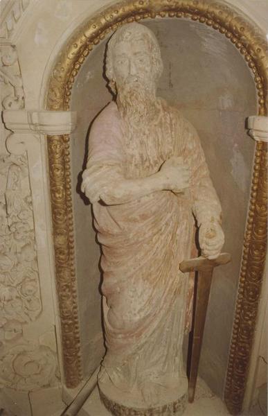 retable, 3 statues, 2 groupes sculptés du maître-autel : saint Pierre, saint Paul, saint Joseph et l'Enfant Jésus, saint Méliau, sainte Marguerite et le dragon
