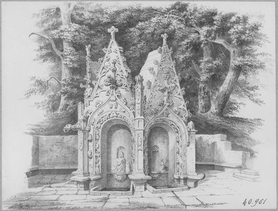 Dans la niche d'une charmante fontaine à compartiments, devant la chapelle de Saint-Nicodème, se trouve la statuette du saint ayant à sa droite un boeuf et à sa gauche un homme et une femme.