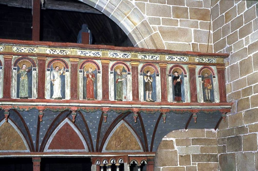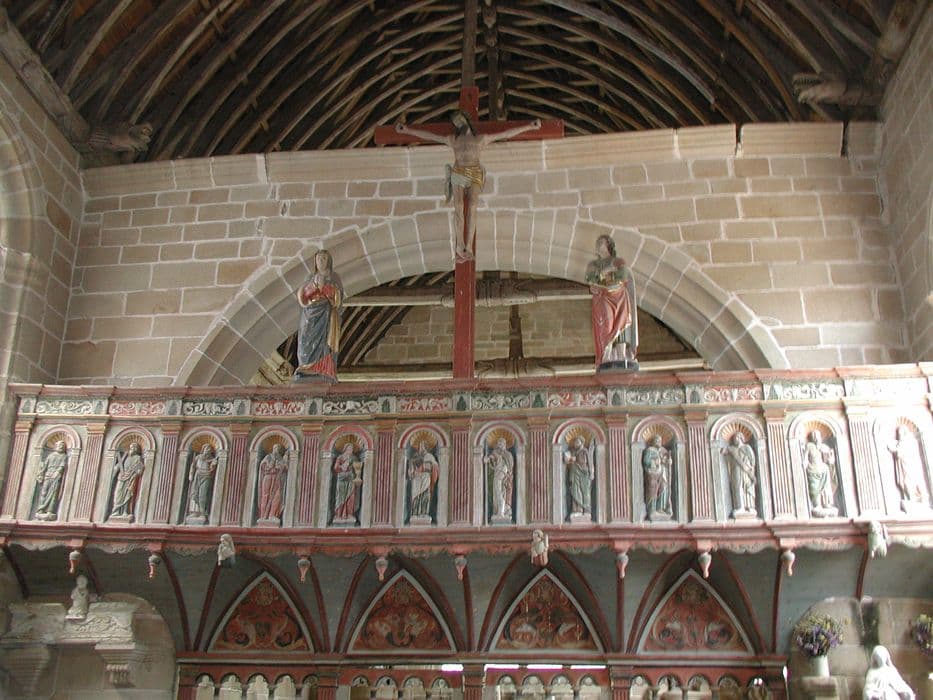 Ce jubé porte sur sa galerie du côté de l'autel douze personnages sculptés. Du côté de la nef, statuettes des douze apôtres. Galerie au-dessous formée de colonnettes avec trilobes supportant quatre arcades ogivales. Au-dessus du jubé, le crucifix entre les statuettes de la sainte Vierge et de saint Jean.