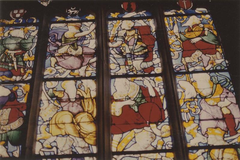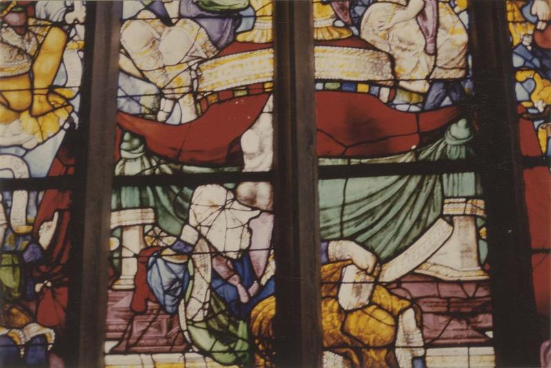 Fenêtre de l'abside : l'Arbre de Jessé, divisé en quatre travées. Fenêtre du croisillon Sud : la Passion, divisée en dix panneaux. La Circoncision.