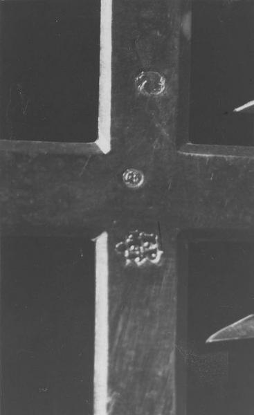 Poinçon de maître : JPMT, poinçon de maître de Joseph Pierre Marie Tiret, orfèvre de Vannes (sur la croix). Poinçon : coq (sur la croix). Poinçon : tête d'homme (sur la croix).