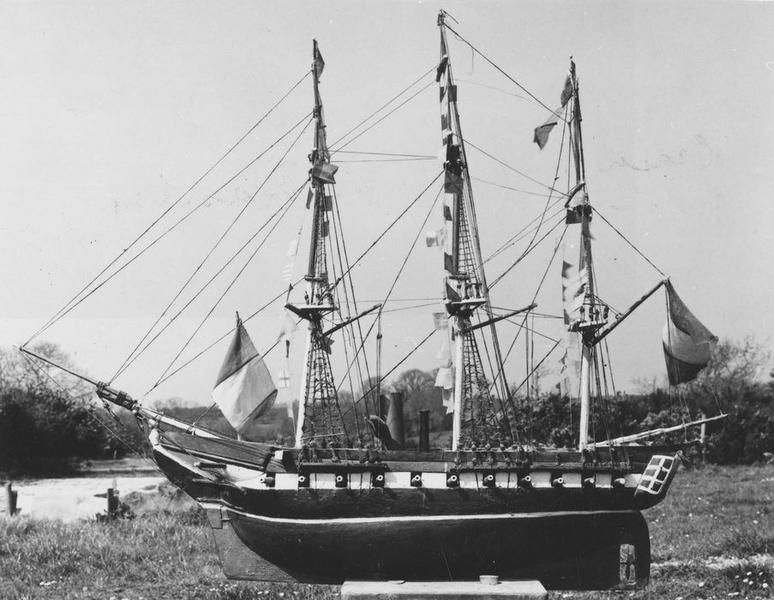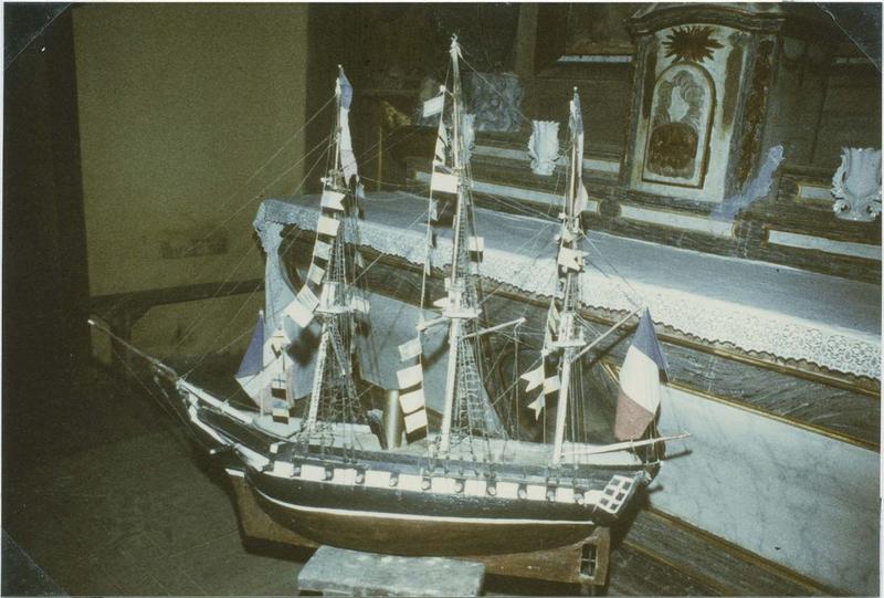 Maquette de la frégate trois mâts carré à propulsion mixte le sainte-Hélène. Coque : sous ligne de flottaison, en marron ; noir au-dessus ; bande blanche au niveau de la batterie ; figure de proue féminine. Armement : batterie de onze canons marrons. Pont : gaillards légèrement surélevés ; cheminée. Mâture : mâts avant et arrière avec deux vergues ; trois vergues à chaque mât ; quatre fanions tricolore ; mâts peints en blanc dans la partie inférieure, en marron dans la partie supérieure.