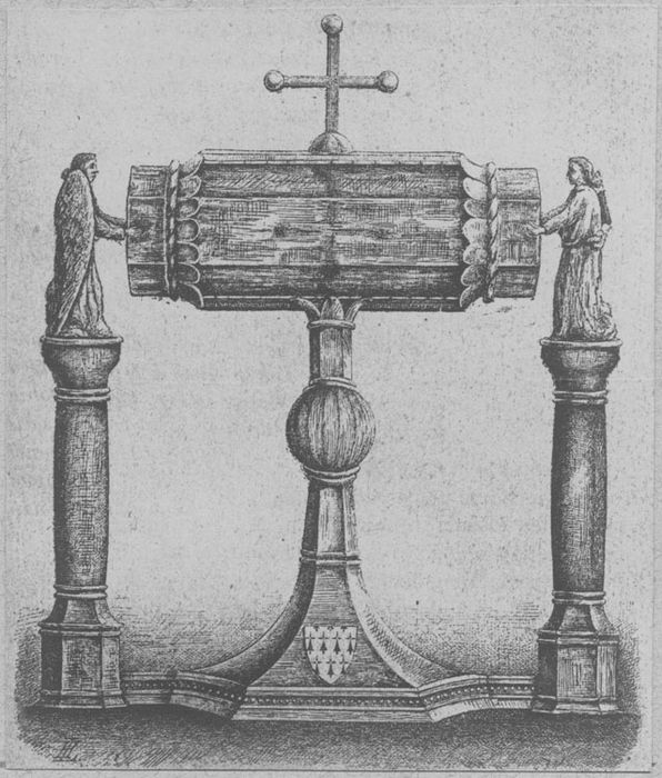 Reliquaire pédiculé. Cylindre horizontal et crucifix, soutenu par deux anges fixés sur deux colonnes renflées et par un pied dont la tige hexagonale est centrée d'un noeud sphérique et porte l'écu de Bretagne à sa base. Une galerie formant terrasse réunit le pied du reliquaire aux bases des deux colonnes.