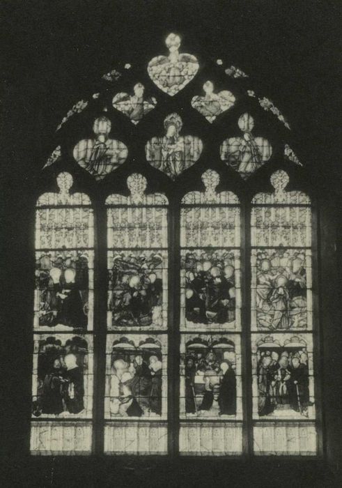 Inscription : (Rencontre de saint Joachim et de sainte Anne). Inscription : (Naissance de la Vierge). Inscription : (Présentation de la Vierge au temple). Inscription : (Les épousailles de la Vierge). Inscription : (Visitation). Inscription : (Nativité). Inscription : (Assomption). Inscription : L'an mil cinq cens et CCCCXX et encore XIII pour bien compter trésoriers estaient les Jonins Me fist à Rennes Berma vitrier (au bas de la Présentation au temple). Marque d'auteur : Me fist à Rennes Berma vitrier (au bas de la Présentation au temple). Date : 1493 (au bas de la Présentation au temple).