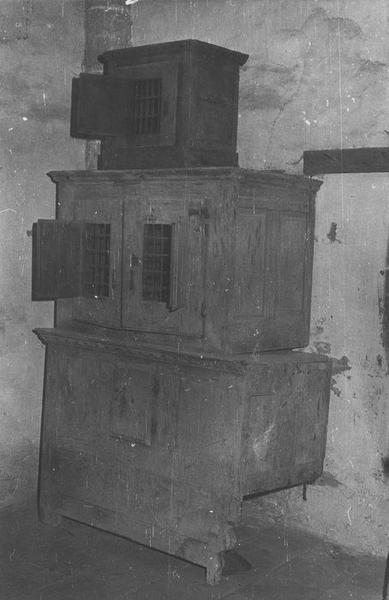 Meuble à reliques à trois corps. Le bahut inférieur n'a que deux pieds à l'avant. Le dos s'appuie contre le mur. Il s'ouvre en son centre par une petite porte à serrure ferrée. Le rebord de son plateau forme une corniche à modillons. La deuxième partie plus étroite s'ouvre à l'avant par deux battants évidés en leur centre. Des grilles et des volets ferment ces ouvertures. Le troisième élément présente les mêmes particularités dans des dimensions beaucoup plus réduites (une seule ouverture).