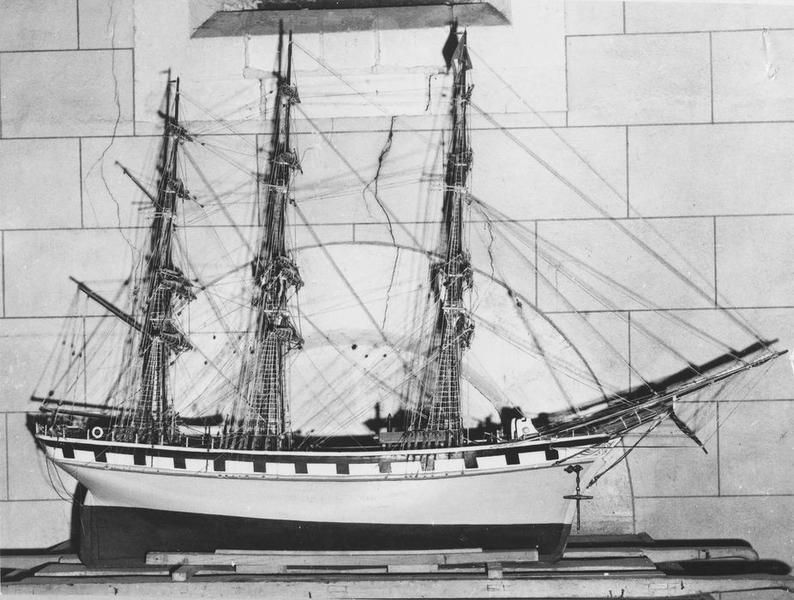 Maquette de procession du trois mâts carré de commerce le saint-Nicolas de la compagnie Bordes de Nantes. Coque : au-dessous de la ligne de flottaison, en marron, au-dessus en gris bleu, bande blanche au niveau de la fausse batterie (sabords noirs) liseré or et bandes blanches puis noire en bordée ; la figure de proue représente saint Nicolas. Armement : une batterie de treize faux sabords de chaque côté. Pont : sur le pont, vergue et mât de remplacement, cabestan, cloche, treuil en bois, . . . ; pont et gaillards de couleur bois ; deux embarcations suspendues dont une disparue à tribord. Mâture : cinq vergues à chaque mât ; voiles ferlées (sculpture dans le bois) ; pavillon de la Cie au premier mât.
