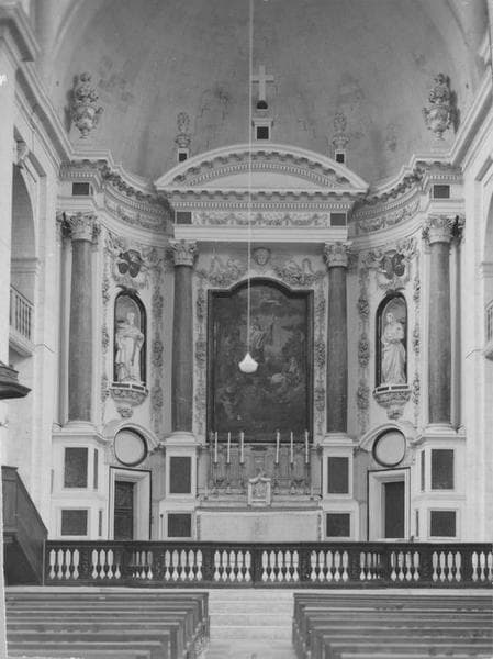 Retable avec toile peinte et maître-autel et balustrade de communion, bois sculpté, marbre polychrome et pierre blanche, 17e siècle. Le retable se divise en trois parties délimitées par quatre colonnes qui supportent des entablements. La partie centrale est ornée d'un grand tableau, elle est amortie d'un fronton cintré. Ces côtés, incurvés pour épouser la forme du choeur, sont garnis de deux niches au-dessus desquelles, des écussons, malheureusement martelés pendant la Révolution, sont surmontées d'une couronne portée par des anges. Dans les niches, statues de sainte Anne et saint Joachim. Au-dessous, des médaillons unis surmontent deux portes. L'autel, en bois sculpté et doré, orné de statuettes, est de la seconde moitié du 18e siècle.