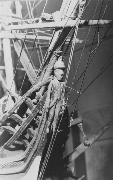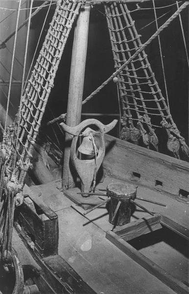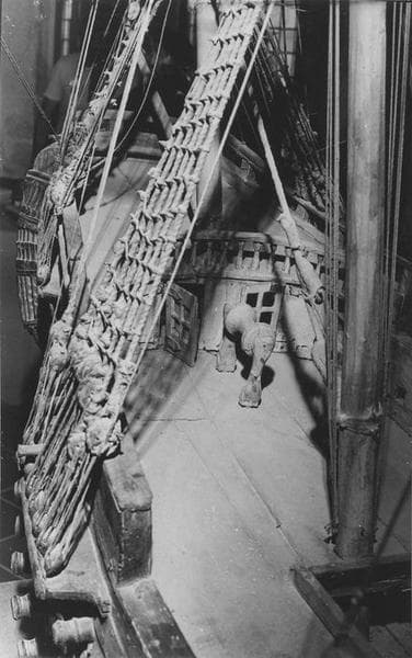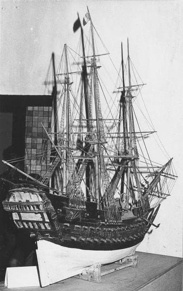 Maquette d'un trois-mâts carré le Mino. Coque : sous ligne de flottaison en blanc, au-dessus couleur bois avec deux bandes rouges aux niveaux des batteries ; figure de proue (personnage) ; deux ancres ; gouvernail mobile. Armement : deux batteries de chaque côté (au total : quatre-vingt-dix sabords dont deux sabords de retraits à l'arrière. Pont : gaillards surélevés ; pont très oeuvré ; cloche, cabestan, mais aucune embarcation. Mâture : trois vergues et deux hunes à chaque mât ; pavillon tricolore au sommet du grand mât.