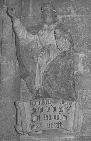 Statue d'un personnage agenouillé sur une console portant une inscription. Personnage en bois polychrome. Console en granit peint.