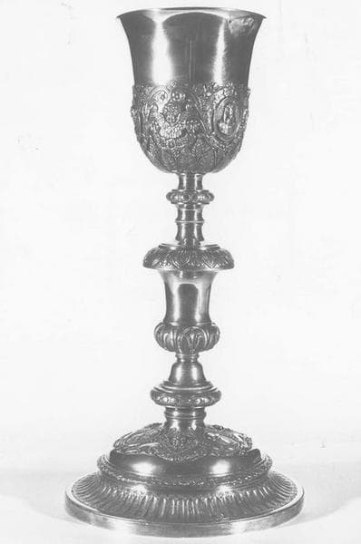 Le pied circulaire à profil en cavet orné de canneaux et d'un rang de raies de coeur. Le dessus du pied comprend, sur une surface amatie, un décor d'enroulements, de blé, de vignes et de roseaux en alternance avec 3 médaillons représentent le Christ en croix . La tige est constituée de petites bagues à godrons et de 2 colerettes à oves. La colerette inférieure est amatie en poire. Ces colerettes encadrent 1 noeud en vase Médicis décoré de grandes palmettes et de raies de coeur. La fausse coupe présente à la base un décor de feuilles lancéolées. Des enroulements affrontés et des guirlandes fleuries assorties de fleurs de blé et de vignes s'épanouissent autour de 3 têtes d'angelots ailes en alternance avec 3 médaillons représentant, sur fond amati, le Christ, la Vierge et saint Jean