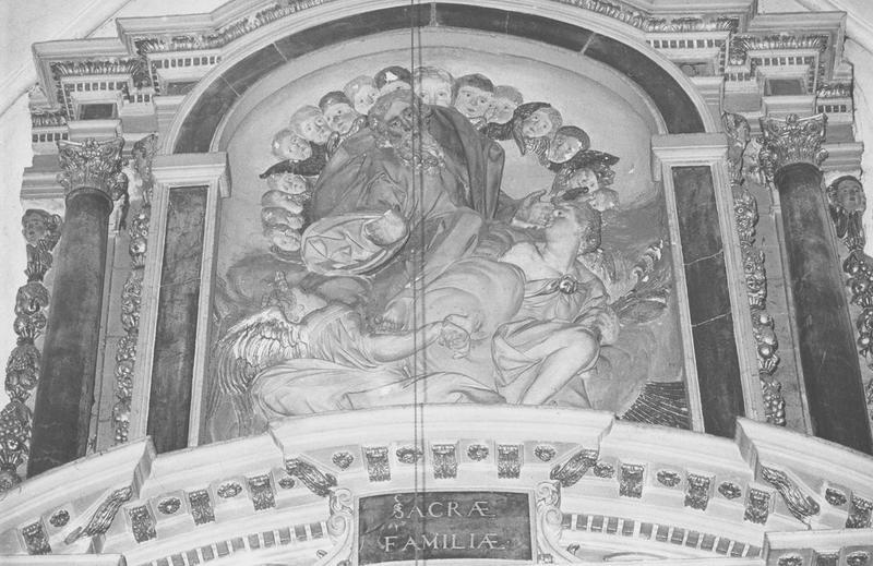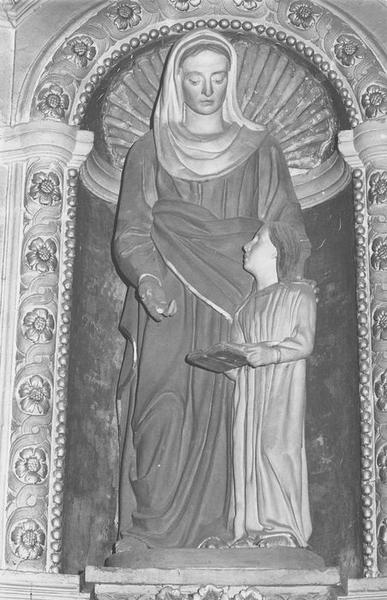 Marbre noir de Sablé, tuffeau et terre cuite. Retable à deux niveaux et trois corps encadrés chacun par deux colonnes de marbre noir à chapiteaux corinthiens. Deux ailes latérales sont incurvées et comprennent une niche cintrée avec au Sud, le groupe de sainte Anne et la Vierge (19e siècle, plâtre) et au Nord, saint Joachim (17e siècle). Les statues reposent sur des consoles ornées de blasons. La niche centrale comprend une statue de la Vierge à l'Enfant (19e siècle). L'entablement est à ressauts avec un fronton central curviligne. Dans les parties supérieures latérales, niches avec les statues de sainte Ursule au Sud et saint augustin au Nord (toutes deux en terre cuite). Le tabernacle plat, en bois, est rapporté (porte décorée d'un calice, début 19e siècle). Le retable est amputé de sa partie inférieure dans laquelle s'ouvrent deux portes latérales. L'autel a également disparu.
