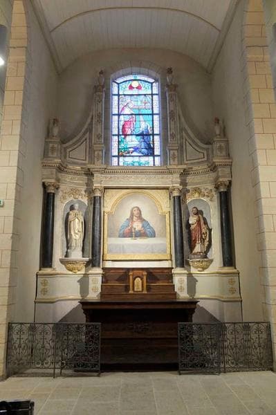Retable construit selon un plan à trois étages et à trois corps séparés par quatre colonnes formant saillie ; les ailes sont incurvées et, dans sa partie supérieure, l'élément central encadre une baie ornée d'un vitrail.