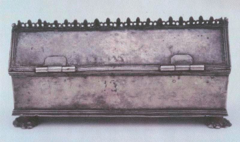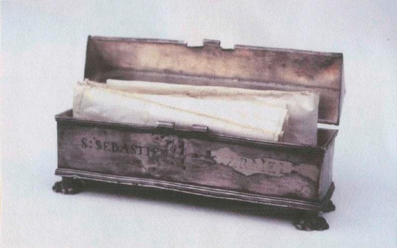 Le reliquaire double, en forme de chapelle, est porté par quatre pattes de lions. Décor du faîte du toit d'une série de fleurs de lys. Inscription sur une des faces : S : SEBASTIEN S : ARMEL, rappelant la double dédicace du reliquaire. Petit fermoir en arge