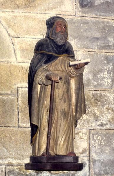 Saint au capuchon relevé et s'appuyant sur un bâton.
