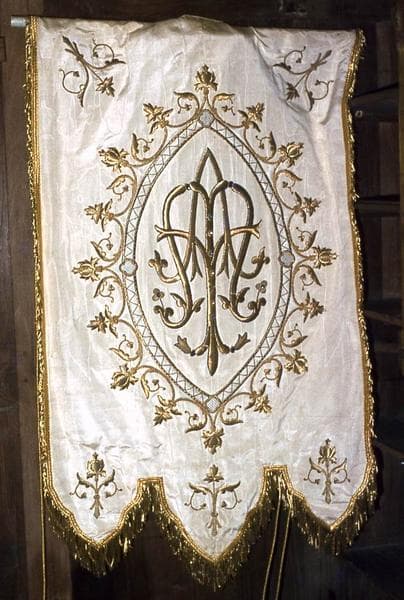 D'un côté, la bannière est ornée de la Vierge couronnée tenant l'Enfant Jésus dans ses bras, également couronné. De l'autre, le monogramme de la Vierge.