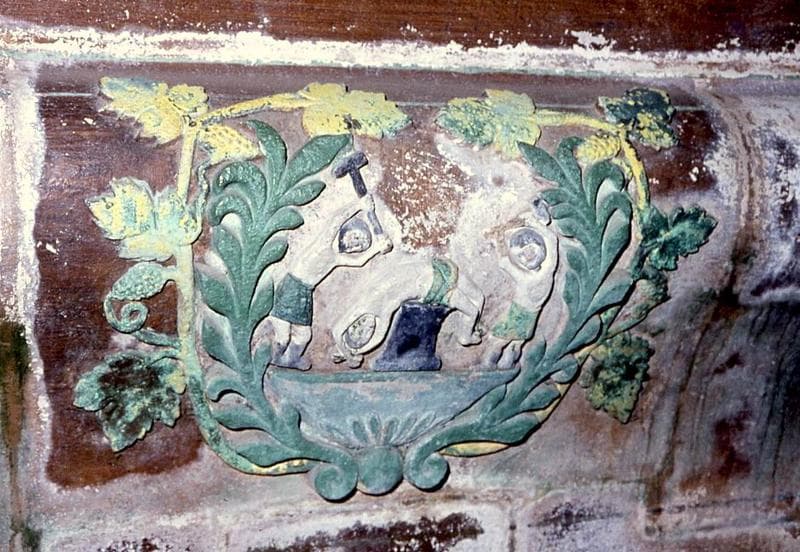 Tabernacle orné d'un motif en relief représentant le martyre de saint Adrien et deux anges priant.