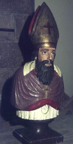 Cinq bustes non identifiés : deux évêques, un saint soldat en armure et deux personnages saints.
