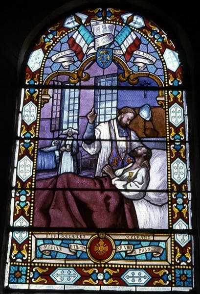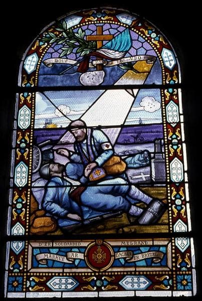 deux verrières aux morts de la guerre : Extrême onction dans un hôpital militaire et Secouriste de la croix rouge sur le champ de bataille