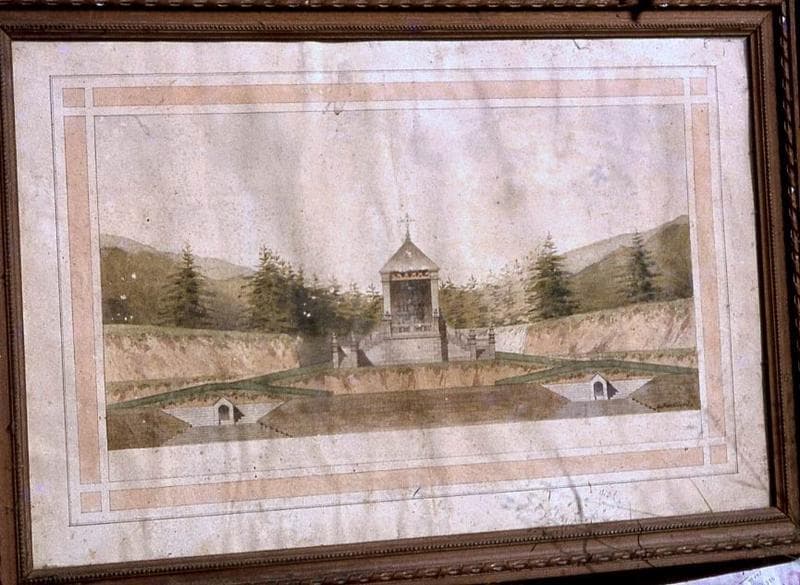 Dessin d'architecture représentant le petit oratoire surmontant la chapelle Notre-Dame du Guelhouit appelé Loggia du Guelhouit et ses fontaines.