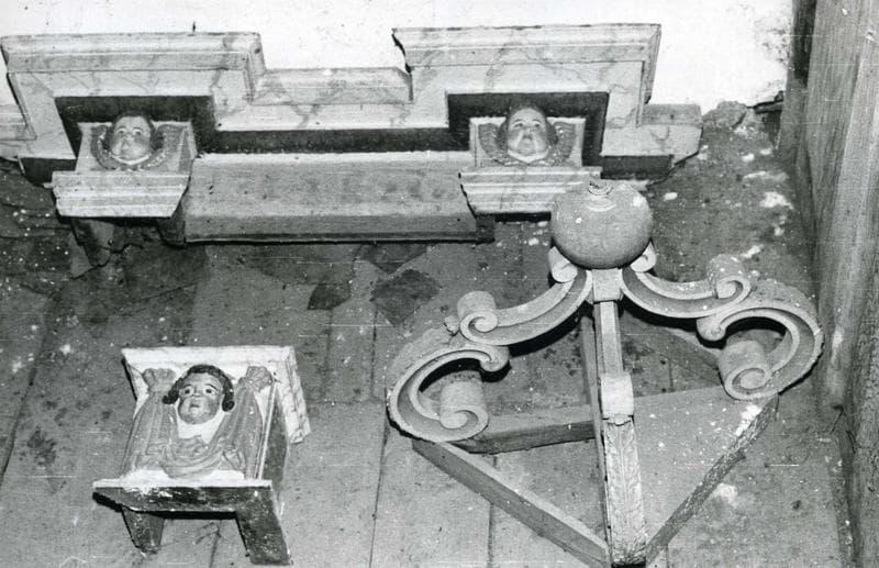 Trois éléments de l'ancien retable : un fragment d'entablement décoré de deux têtes d'angelots, un fragment d'architecture décoré d'une tête d'angelot encadrée d'un motif de draperie et un fragment de baldaquin (probablement un dais d'autel).