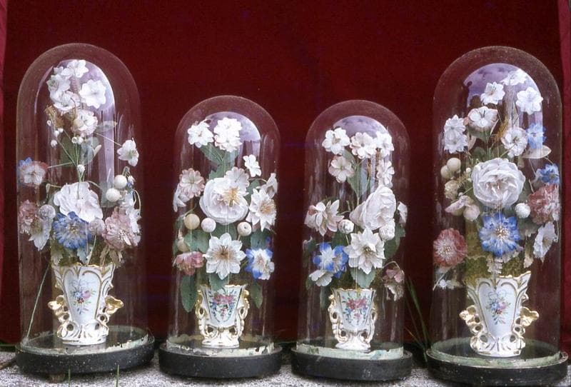 Quatre bouquets sous globe en verre : deux petits et deux grands.