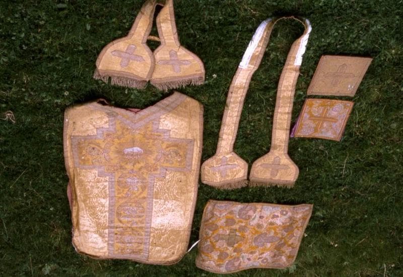 Ornement liturgique composé d'une chasuble, d'une étole de clerc, d'un manipule, d'un voile de calice et de deux bourses de corporal.