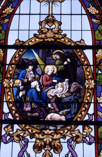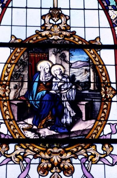 ensemble de sept verrières : Education de la Vierge, Adoration des bergers, Saint Maudé, Martyre d'un saint, Colombe de l'Esprit-Saint et Apparition à Lourdes