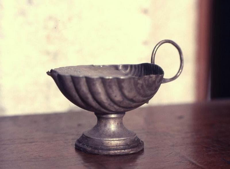 Coquille de baptême munie d'une anse et d'un couvercle partiel.