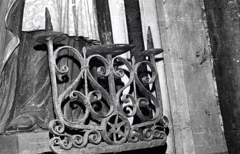 Deux portes-cierges en fer forgé devant les statues de saint Malo et saint Patern du retable majeur.