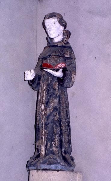 Moine tenant un livre de la main gauche et un attribut (manquant) de la main droite, probablement un bâton.